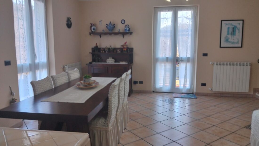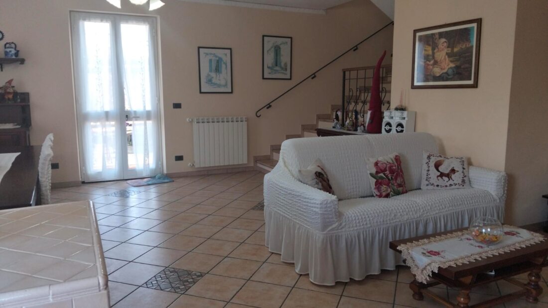 3 porte finestre conducono al giardino circostante in parte lastricato, disimpegno con locale caldaia e bagno di servizio.
