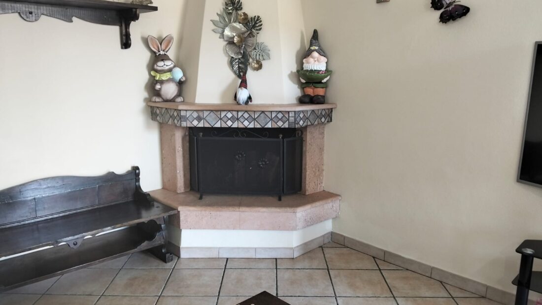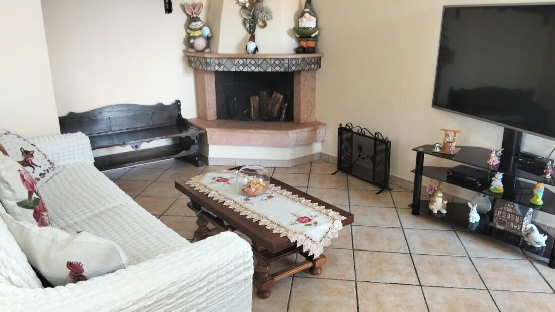 P.T: ingresso in ampio salone con camino e angolo cottura a vista.