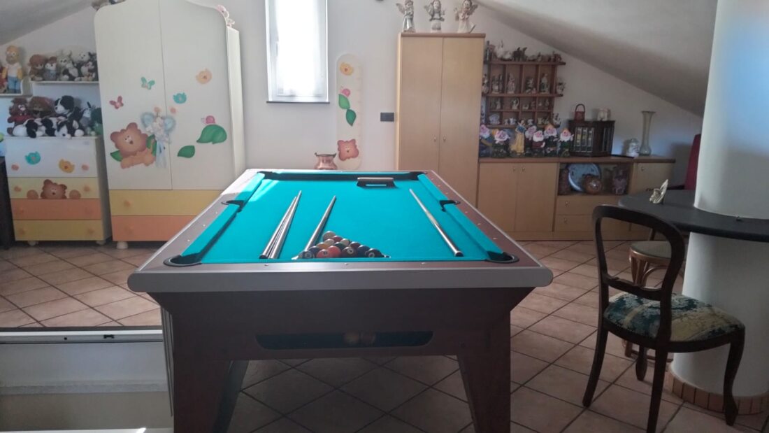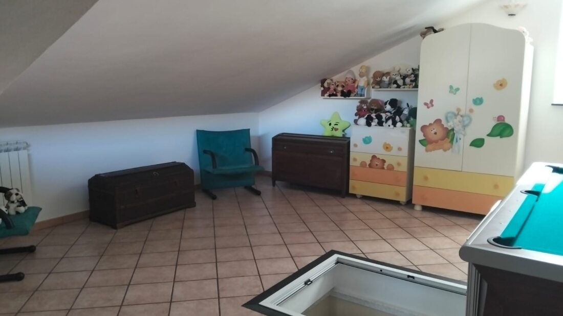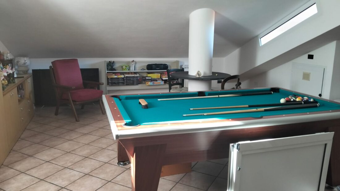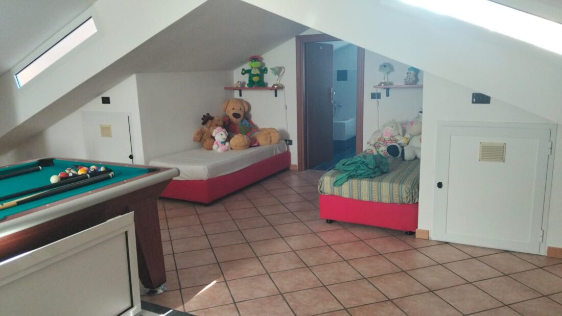Il p.1° è caratterizzato dalla zona notte con 3 ampie e luminose camere da letto di cui una con balcone, bagno con vasca; una scala a chiocciola in legno conduce ad un singolare e spazioso piano mansardato (30 mq) in cui troneggia un biliardo, divano letto e bagno.